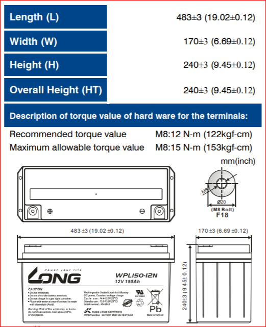 | WPL150-12N | 12V-150Ah (10HR) | 6 cells VRLA AGM / Non-Spillable / Maintenance-Free |